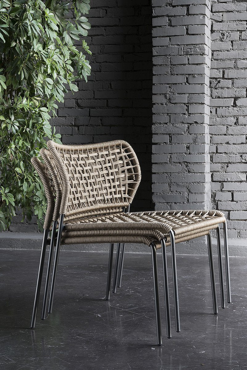 Materials:  Structure in tubular steel with black or gray powder coat finish.  Handwoven fire retardant rope (Kevlar & PET).  Stacks 6 pieces high.  Indoor / outdoor.