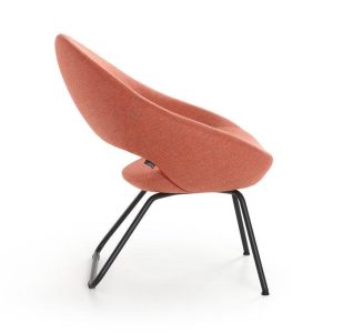 The Shark Lounge gets its shape from a steel insert frame and a wooden seat that is then foam covered and upholstered. The Shark Chair is available with a polished chrome 4-leg or sled base.